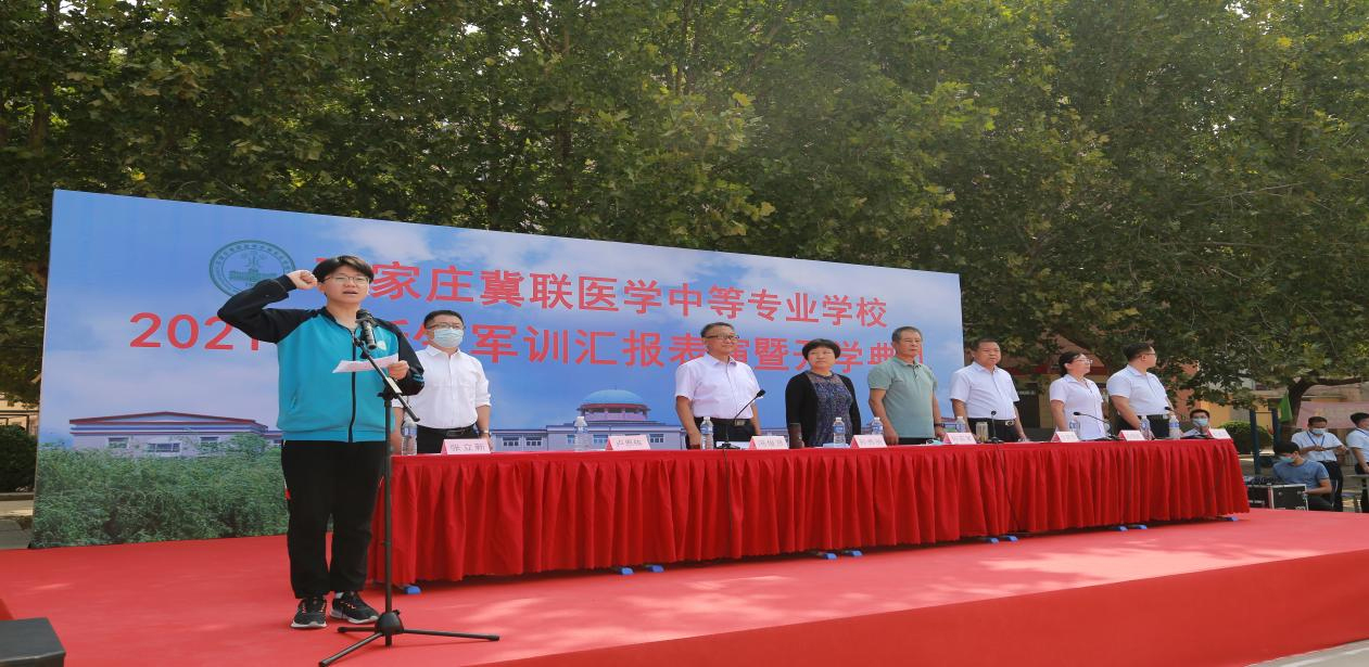 “古之立大事者,不惟有超世之才,亦必有坚忍不拔之志”。赤日当空,皎阳似火,2021年9月11日,上午9时,石家庄冀联医学中等专业学校2021级新生军训汇报表演暨开学典礼在威严、神圣的国歌声中拉开帷幕。河北冀兆联科技发展有限责任公司孙苏军副董事长、河北冀兆联科技发展有限责任公司孙秀丽总监、石家庄冀联医学中等专业学校张建奇董事长、石家庄冀联医学中等专业学校冯俊贤校长、河北龙焱军训团卢恩栋团长、石家庄冀联医学中等专业学校副校长张立新、冯瑞娟、杜建国以及全体教职工和2021级全体新生参加了典礼,杜建国副校长主持典礼。