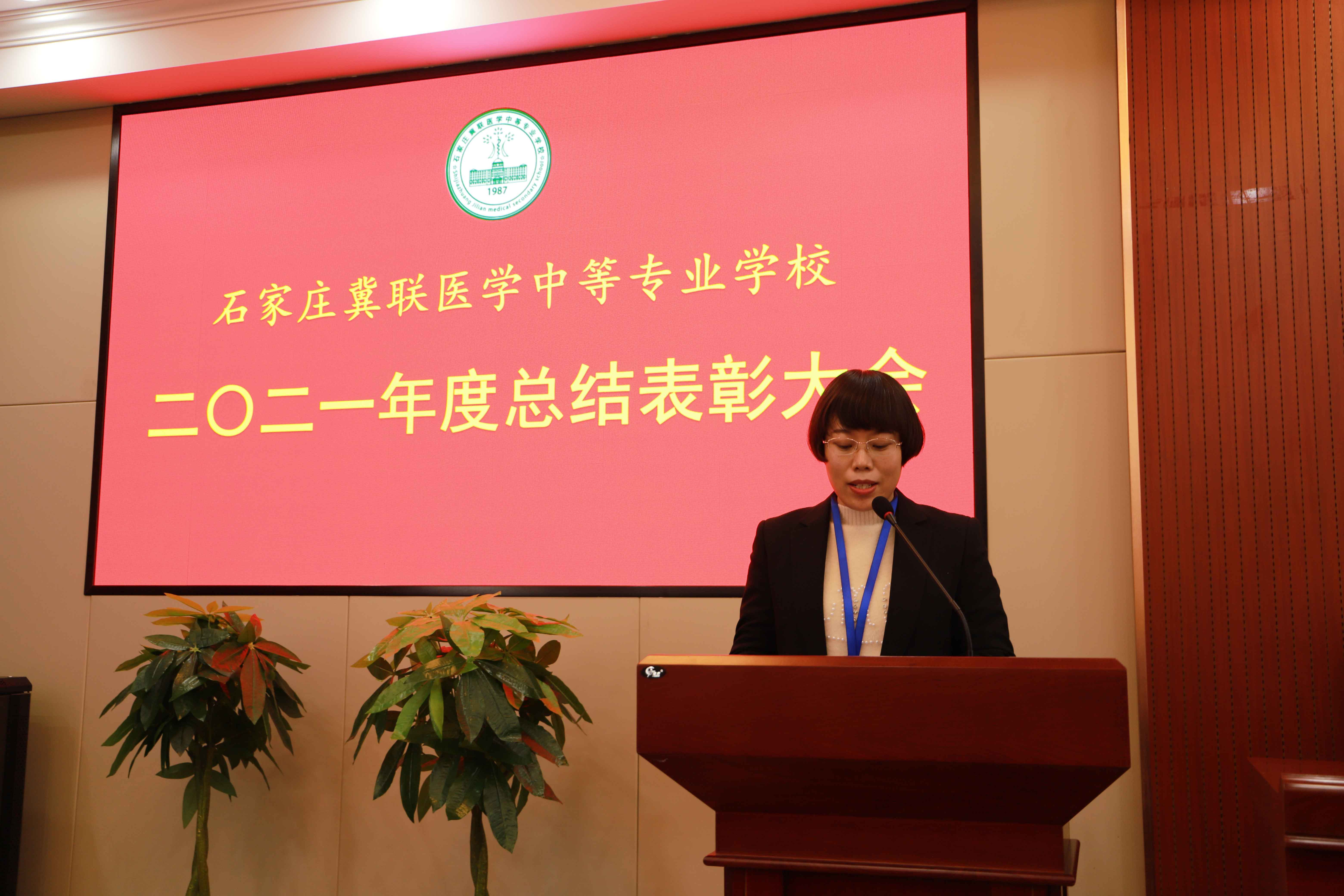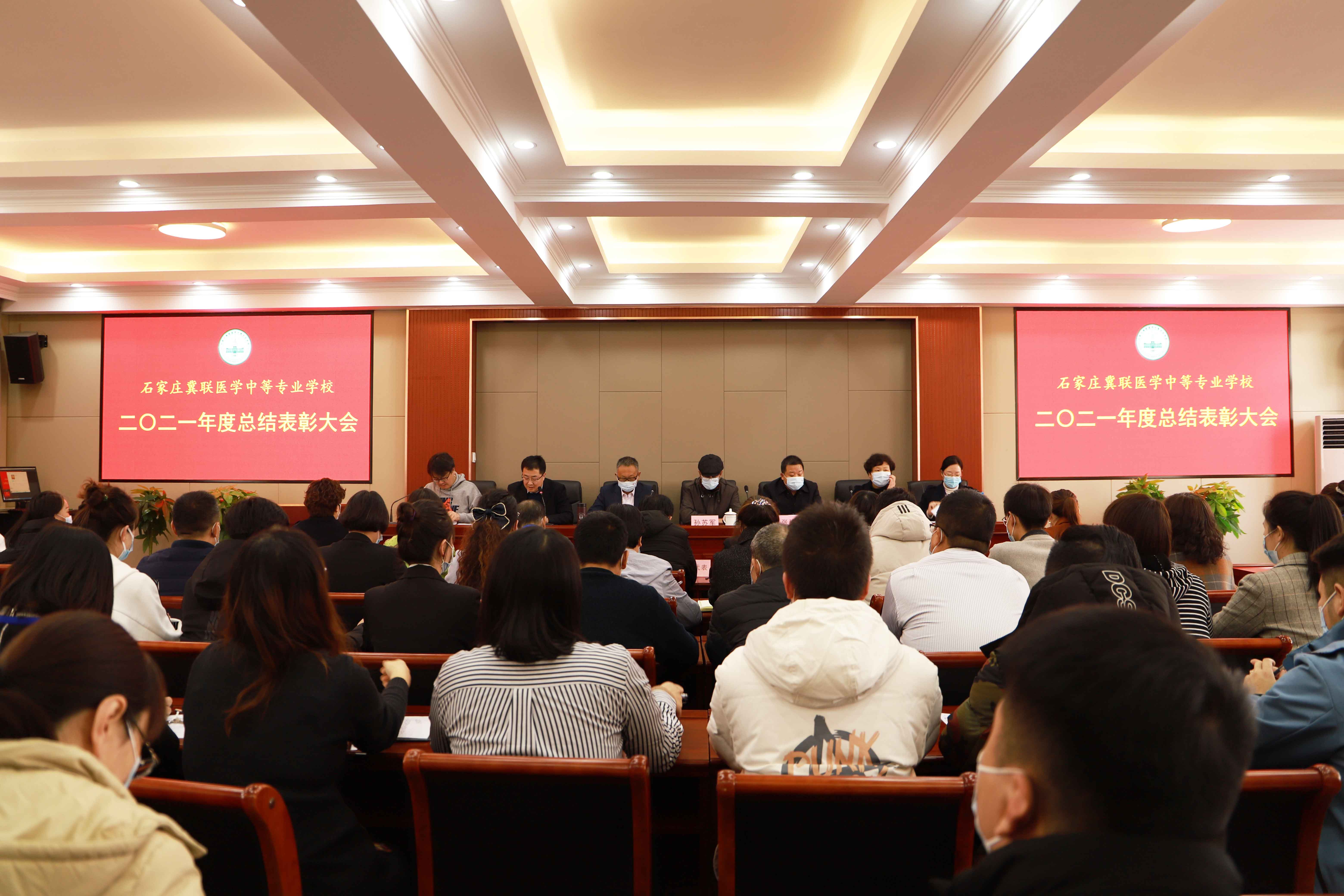 2021年12月24日下午,石家庄冀联医学中等专业学校隆重召开2021度工作总结表彰大会。河北冀兆联科技发展有限责任公司副董事长孙苏军、财务总监孙秀丽莅临指导,学校董事长张建奇、校长冯俊贤、副校长张立新、杜建国、冯瑞娟及全体教职工参加会议,大会由张立新副校长主持。