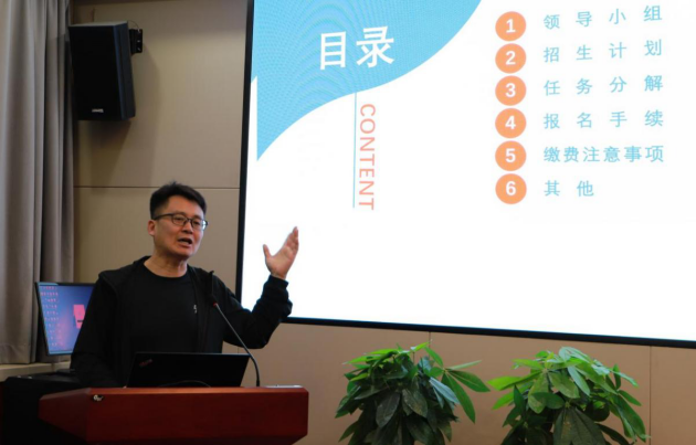 会上,杜建国副校长结合我校2022年秋季招生任务,提出了具体思路,并对下一步工作做了周密的安排和部署,在动员讲话中强调了学校的十大优势,解读了今年的招生政策、招生范围、专业设置、收费标准、报名手续,并对现场报名和网上报名注意事项做了全面地分析和讲解,最后对今年招生政策进行了详细解读,做到按计划招生、按专业招生、按男女比例招生。