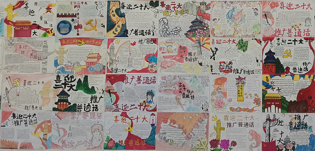 思政组(教师王凯)和语文组(教师王晓、刘璐、韩同敏)老师组织全校学生开展“喜迎二十大、推广普通话”主题手抄报活动。