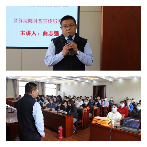 河北省消防协会义务消防科普宣传服务队专职宣传员曲志强首先对全体教职员工进行消防安全知识培训,下午四点,火灾疏散演习正式开始。