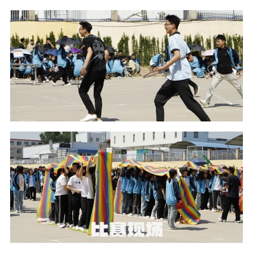 比赛包括个人赛和团体赛两环节,由“丢沙包” 、“战场救援”、“赶猪跑”、 "螃蟹赛跑”、“无敌风火轮”等多个项目组成。率先开赛的是丢沙包比赛,运动员们需要精准的把沙包投入高分环内才能赢得比赛; “战地地救援”比赛赛要求一组多个同学共同完成比赛,有同学险些摔倒,但为不耽误团队进程,仍拼尽全力和同伴冲向终点;团体赛“无敌风火轮〞更是将活动推向高潮,在所有成员共同协作之下,“车轮〞启动,伴随着啦啦队的加油与喝彩越过终点.参赛者凭借自己的实力和团队协作精神,赛出了风格,赛出了水平,取得了精神文明和运动成绩双丰收。比赛结束后,冯瑞娟副校长致运动会闭幕词,她对同学们的高度热情和比赛精神提出表扬,并希望同学们把在比赛上拼搏进取的精神保持下去,融入到今后的生活和学习中,再创佳绩。