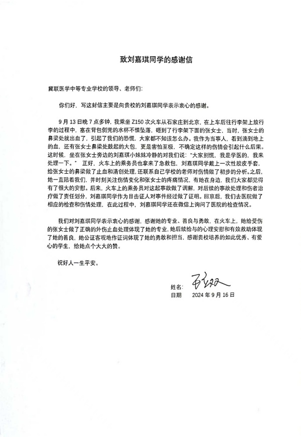 2024年9月13日,在Z150次列车从石家庄开往保定的旅途中,上演了一场温暖而感人的救助行动。冀联医学中等专业学校23级护理八班的刘嘉琪同学,以其沉着冷静的应对和专业的救助,展现了新时代医学生的担当与风采。
