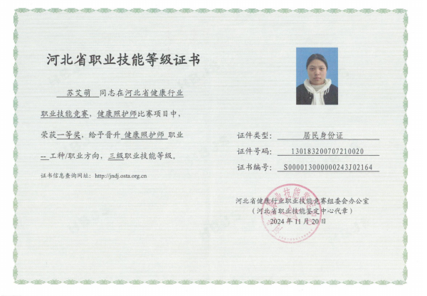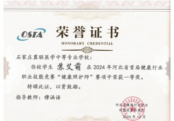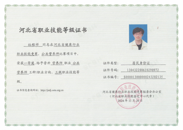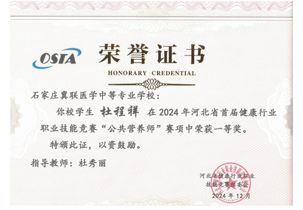 在 2024 年 11 月 5 日-6 日举行的河北省健康行业职业技能竞赛中,苏艾萌同学凭借扎实的专业知识和精湛的操作技能,在“健康照护师”竞赛项目中脱颖而出,勇夺一等奖;杜程祥同学在“公共营养师”竞赛项目中表现优异,一举夺冠。