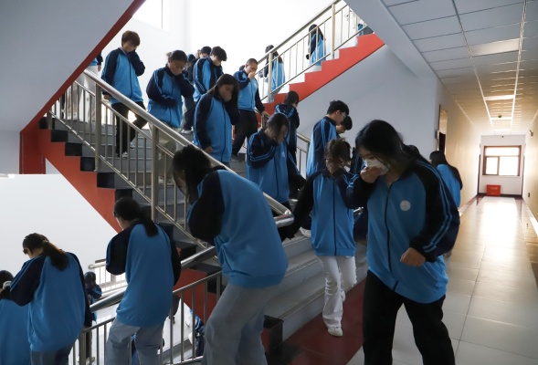 在模拟火灾逃生环节,随着校园内警报声响起,学生在老师的组织下,迅速用湿毛巾捂住口鼻,弯腰低姿,按照预定的疏散路线,紧张有序地撤离到学校操场的安全区域,整个疏散过程秩序井然。