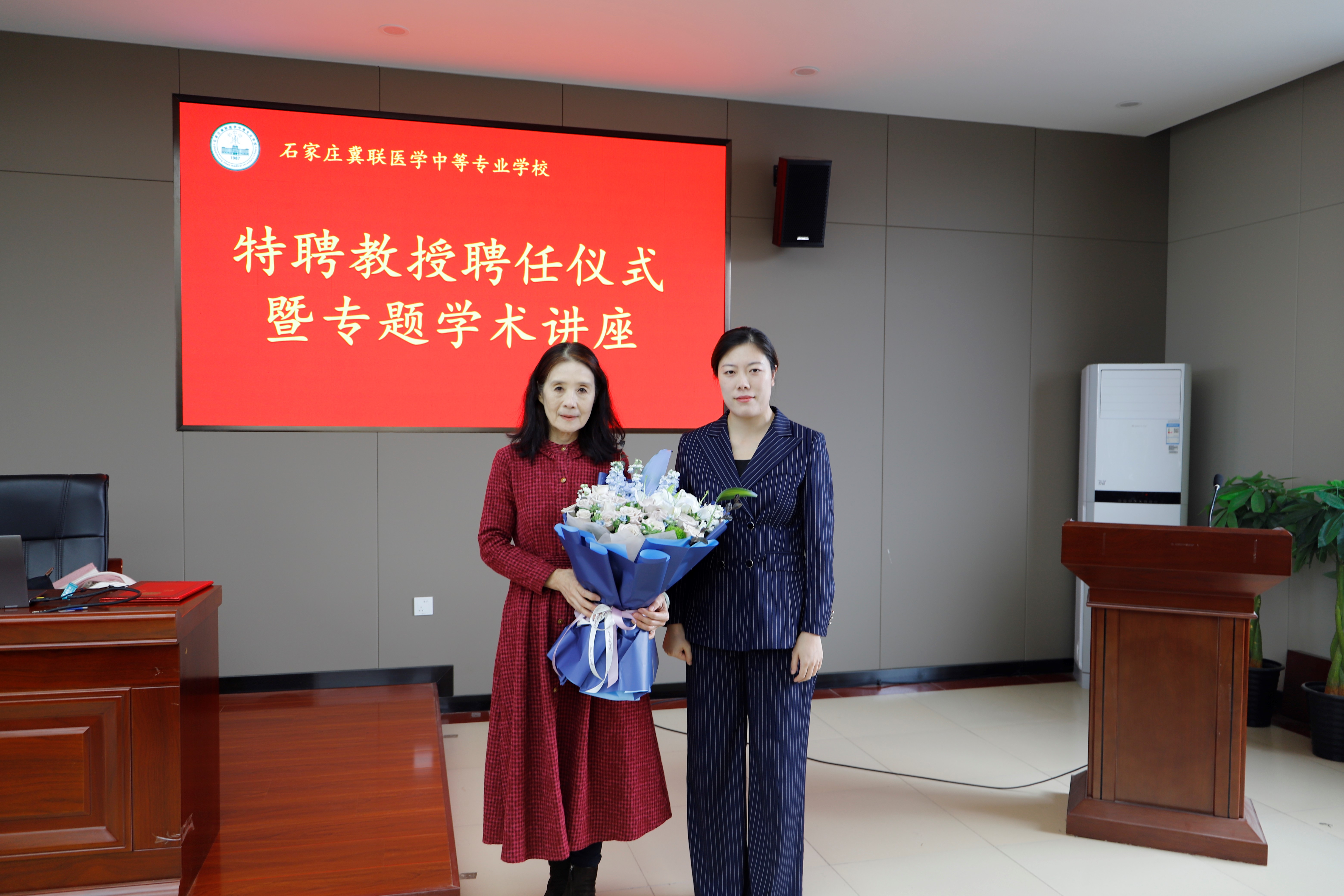 学校张建奇董事长向于洁教授颁发特聘教授聘任证书,并对于洁教授应邀指导学校建设表示热烈欢迎,同时向于洁教授介绍了学校的办学历史和建设成就,希望于洁教授充分发挥自已多年在国内、外医学领域积累的学术专长,积极指导学校的师资队伍及学科能力建设,倾情倾力助推冀联教学工作再上新台阶。随后,专业课教研室王鹤代表学校全体教师向于洁教授献花致敬。